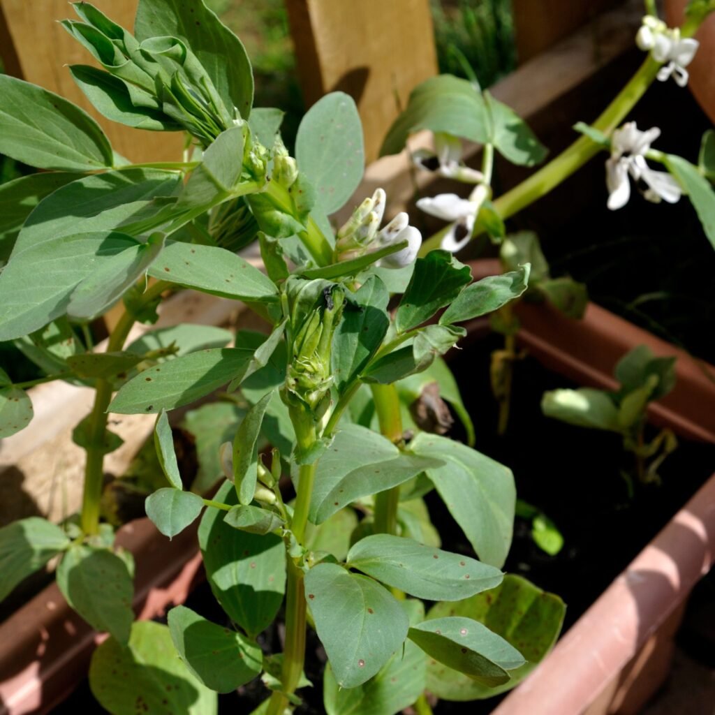 Broad beans are partially self-pollinating but also benefit from bee activity, so avoid pesticide use during flowering.